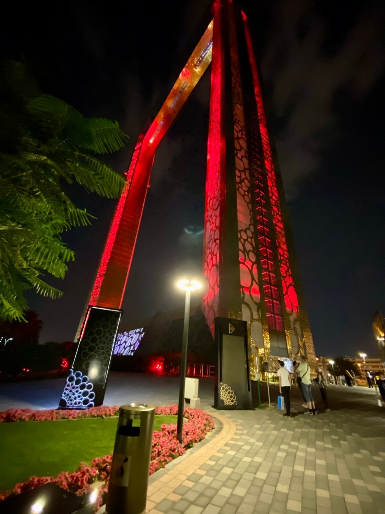 We arrived Dubai in the afternoon and made our way to the apartment to freshen up. In the evening, we ventured out to explore the iconic Dubai Frame, which was not far from our place of stay. The Dubai Frame, holding the title of the world’s largest frame, looked majestic in the distance. It gracefully changed colours like a chameleon. The structure has elevators at both ends—one ascending to the observatory and the other descending. We spent a brief time here treating ourselves to the vibrant charm of the city lights.