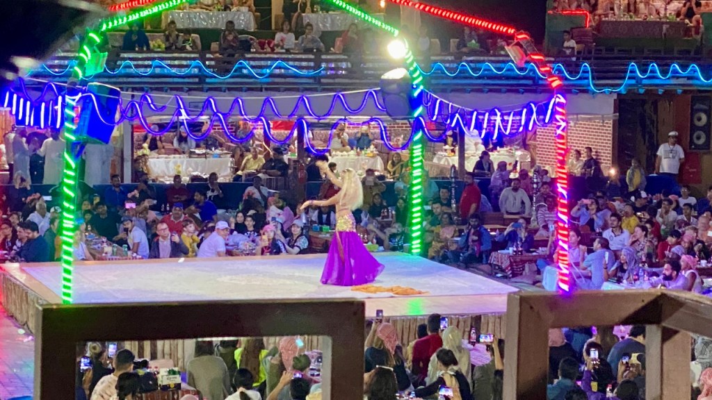 It was dusk and sun dipped below the horizon casting a warm glow upon the vast dunes of the desert.The sole shelter we occupied gave us a 360-degree panorama of the illuminated landscape. The desert breeze, carrying whispered secrets, added a captivating touch to the evening. The sky, crystal clear, allowed us to witness the silent flight of planes high above. Amidst this breathtaking natural setting, the performances unfolded in the centre of the stage, captivating the audience with the fusion of traditional and contemporary acts. We savoured this spectacle while indulging in the delightful cuisine served. I found myself immersed in this magical spectacle. As it night deepened, the sky turned into a sparkling tapestry of stars. It’s truly remarkable how the collaboration of nature and human creativity transforms the desert into an enchanting spectacle, creating a lasting impression in my travel memories.