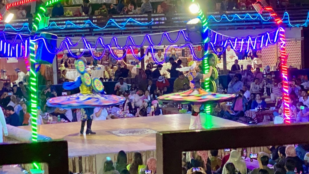 Concluding our desert adventure, the package treated us to a delightful buffet and entertaining performances. The initial seating provided in the package was on the ground floor, but for a better view of the surroundings, we opted to pay an additional 50 dirhams per person to upgrade to level one. This was worthwhile and one of my favourite part there so I’ll try and paint a picture of the experience.