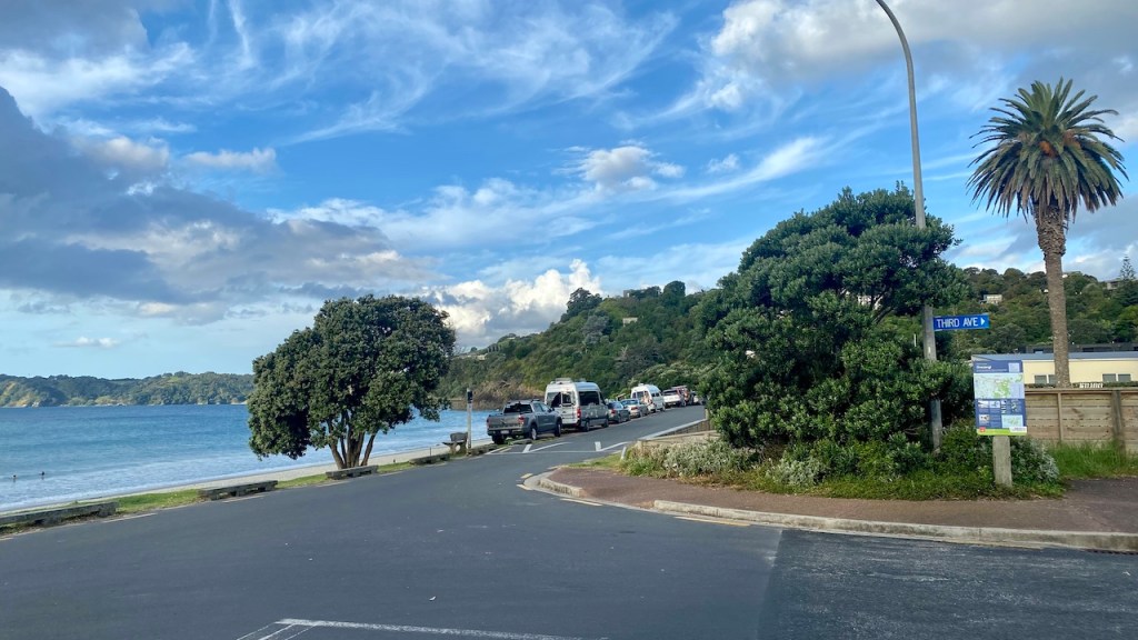 Sunke bada maza aaya. Aur phir ham waha se nikal gaye. Phir pet se awaaz aayi to realise hua ki hamne kuch khaya hi nahi. To wahi pe dusre restaurant chale gaye. Time thoda jyada ho gaya tha to us restaurant me sab kuch serve nahi kar rahe the. To hamne kuch ghaas phus order karke kha liya waha. Phir next hop-on-hop-off wali bus ka wait karne lage. Bus se aage badhe aur ek beach pe utar gaye. Phir map dekha to realise hua ki ek aur achchi jagah hai jo hame dekhni hai aur hamare paas time ki kami hai. To almost beach pe ghumke ham wapis usi bus me baith gaye. Phir last stop pe utare jaha se almost 360 degree view mil raha tha. Waha pe trek ke liye ek raasta tha to trek karne nikal gaye. Ek chota sa waterfall dekha, jo ki bakwas tha aur thodi der me wapis aa gaye. Sunset ka time ho raha tha to view aur bhi sundar ho gaya. Green bed, a blue sky with some clouds and the sun party behind the hills. Best view of the day. Shayad mai thoda biased hu sunsets ki taraf. Phir kya tha, got the bus, back to ferry point, and then back to Auckland.