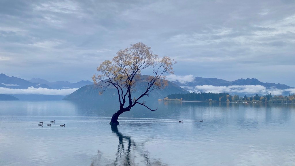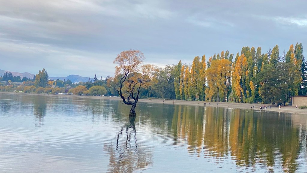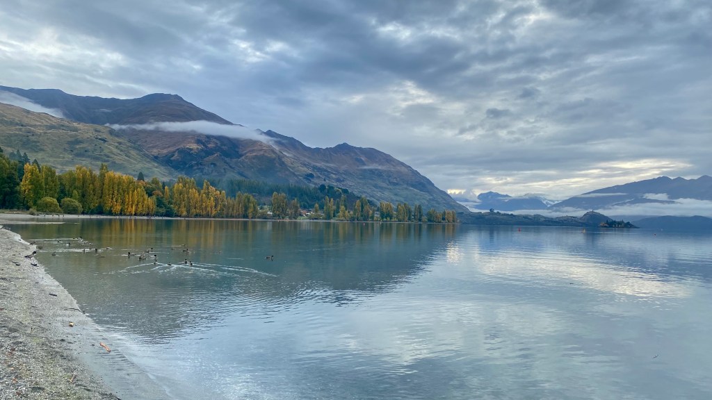 Subah hui aur room se bahar nikale to pahad dikhe. Par ham lake ke paas walk karne chale gaye kyun ki aaj phir hamara stay lake ke paas tha. Wapis aaye, gaadi nikali aur nikal pade Wanaka ki taraf. Kareeb 200kms ka drive tha. Subah ka time tha aur bhook bhi lag rahi thi, to breakfast ki liye ham Twizel me ruk gaye. Twizel autumn ke colors me dhal gaya tha. Waha breakfast kiya, hot chocolate li aur raaste ke liye kuch donuts bhi le liye. Raaste me hamne kaafi stops bhi liye. Pehle to ham High Country Salmon Farm me ruke. Kuch khaas tha nahi, bas Salmon machliya thi bahot saari jinhe log khana khila rahe the.