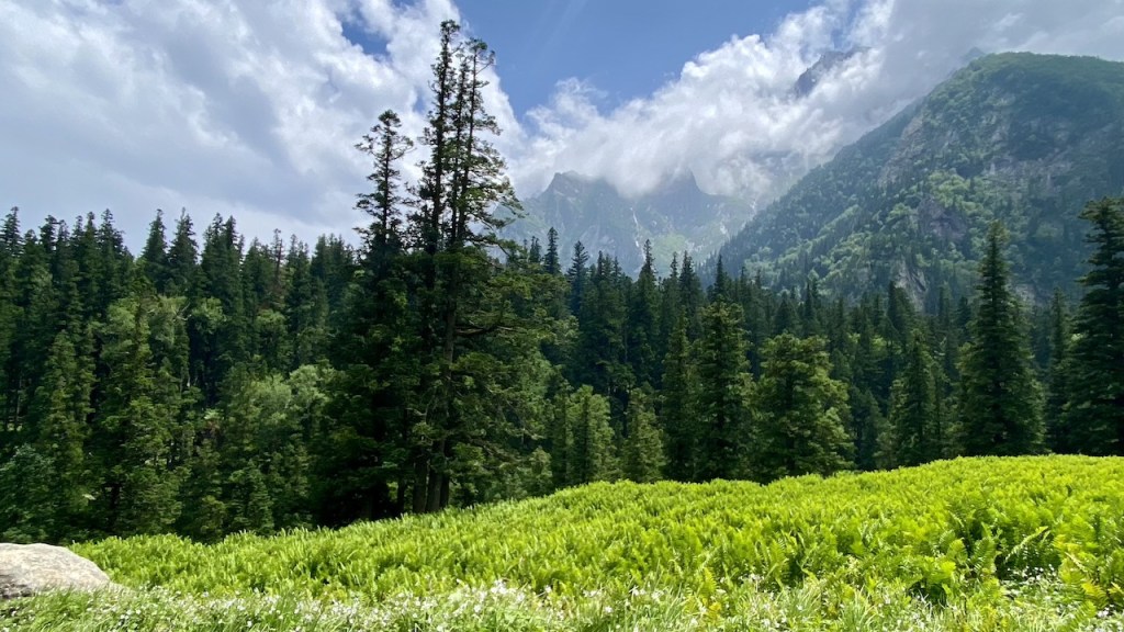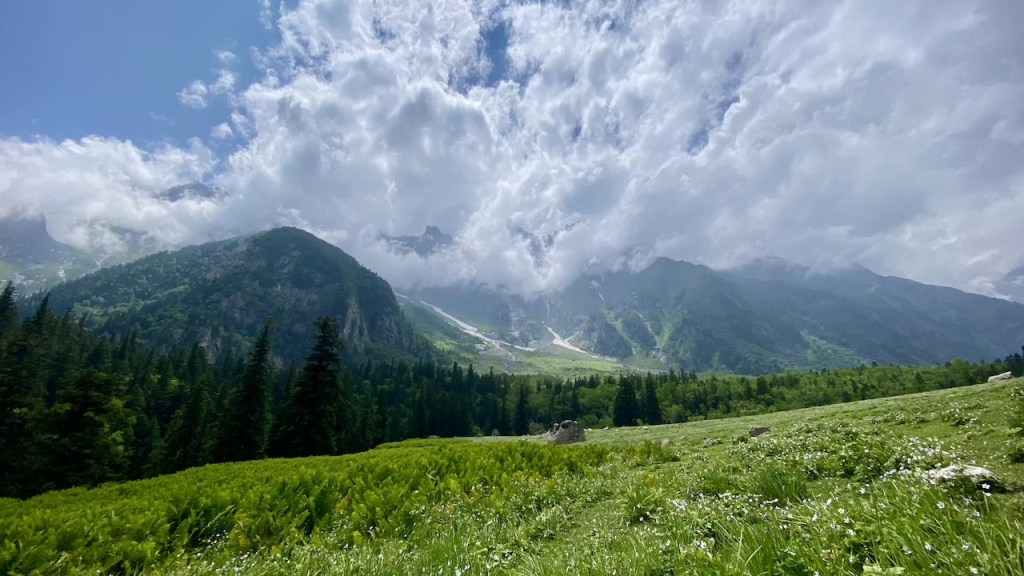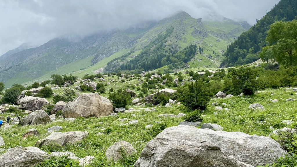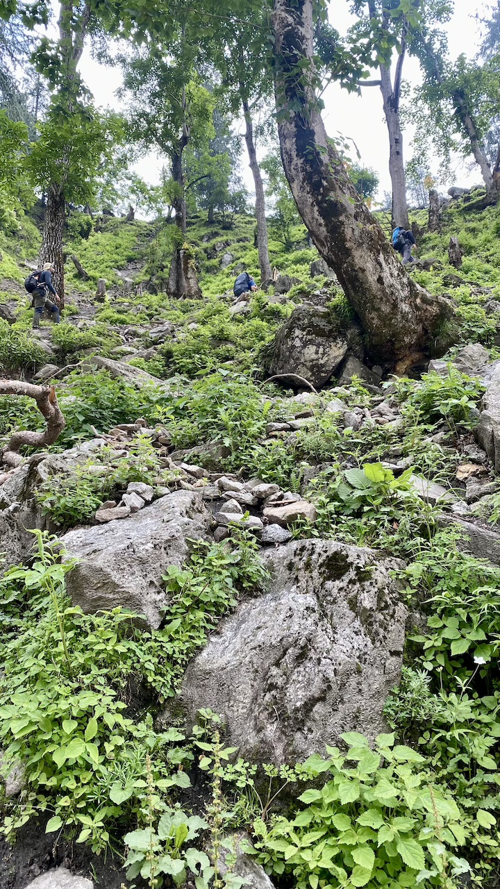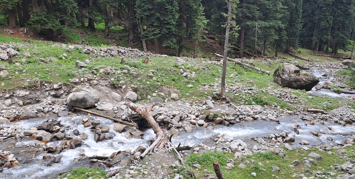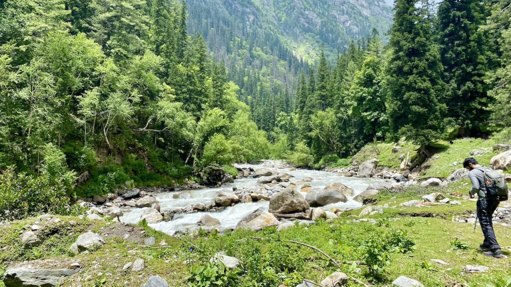 Around 20 minutes into the trek, we lost our phone network. The initial two hours of trekking were on an off-road trail alongside the Bhaba River. Soon after, we entered a dense forest filled with oak, pine, and other trees. It was a long walk in the woods under the shade of these towering trees. We took a break to rest and enjoyed the packed lunch from earlier in the morning. After lunch, we navigated through large boulders and crossed small streams, stepping on precarious logs and stones. Eventually, we emerged into vast open meadows, adding a new and equally beautiful element to our journey.
