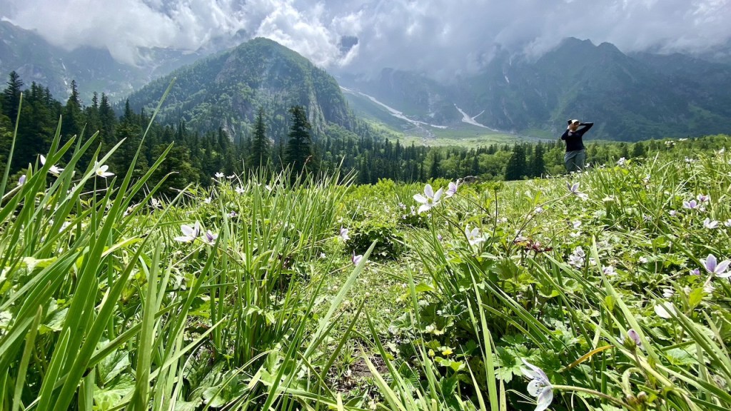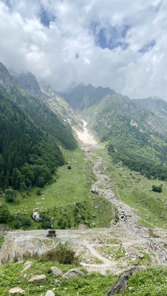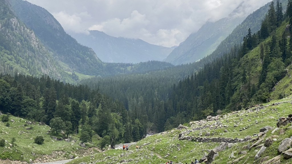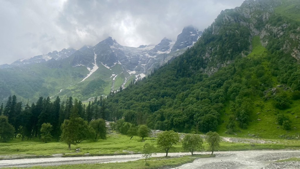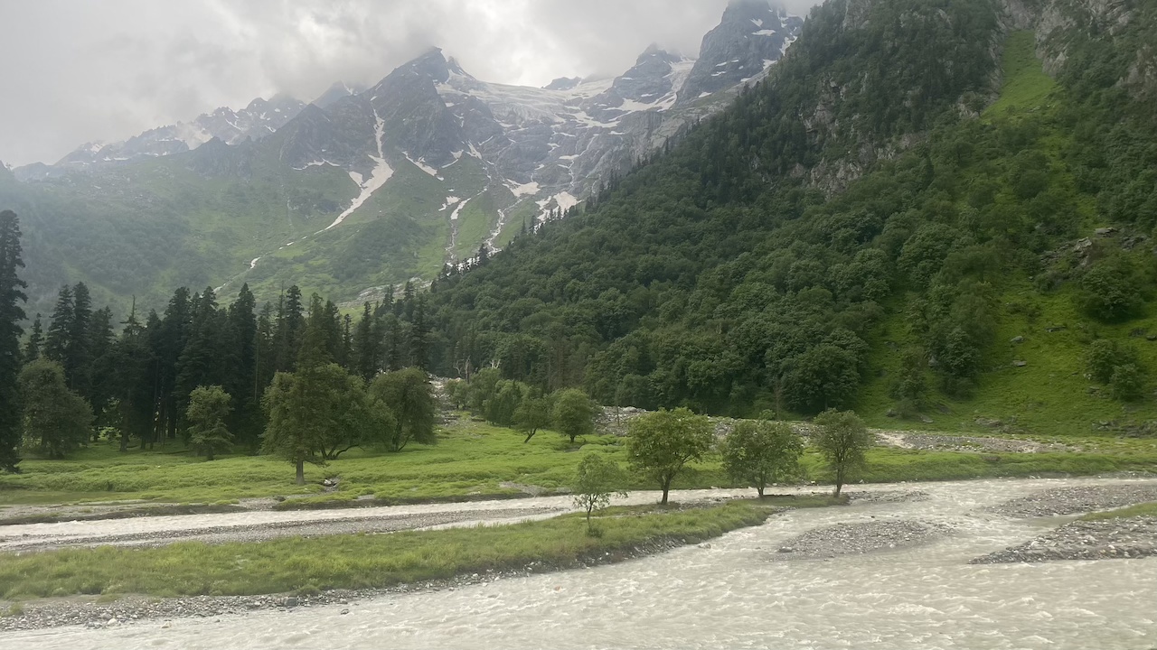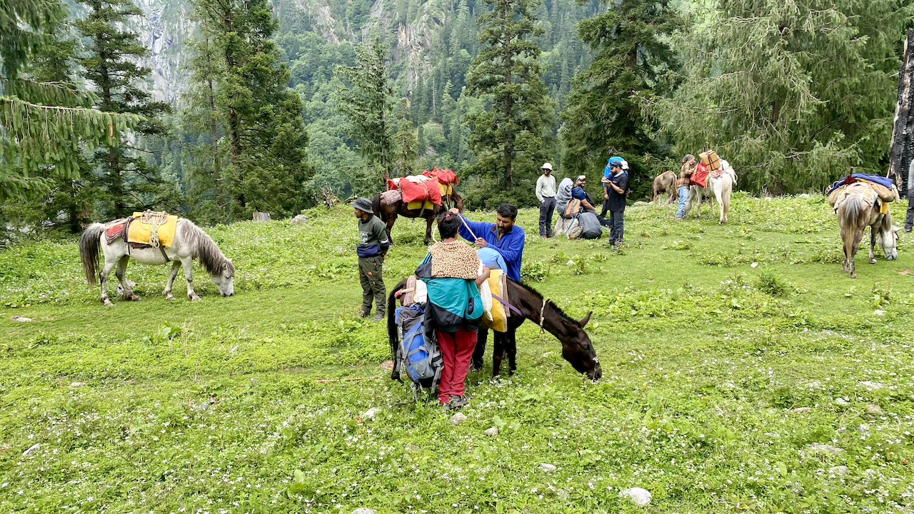 Around 20 minutes into the trek, we lost our phone network. The initial two hours of trekking were on an off-road trail alongside the Bhaba River. Soon after, we entered a dense forest filled with oak, pine, and other trees. It was a long walk in the woods under the shade of these towering trees. We took a break to rest and enjoyed the packed lunch from earlier in the morning. After lunch, we navigated through large boulders and crossed small streams, stepping on precarious logs and stones. Eventually, we emerged into vast open meadows, adding a new and equally beautiful element to our journey.