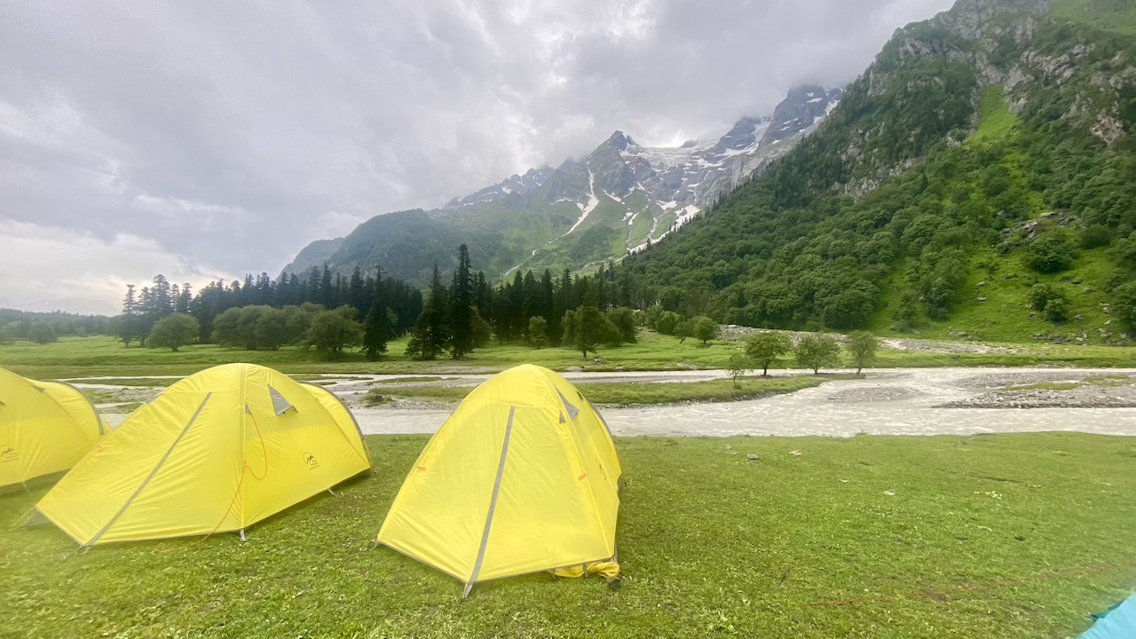 We took a break to admire the stunning view of the meadows. The ground was adorned with lush, towering ferns that seemed large enough to swallow a person whole, while above, the majestic snow-capped mountains stood proudly against the sky. We took this moment to capture photos and soak in the beauty of our surroundings. We soon continued our trek, finding that the toughest climb for the day was behind us and we were now on a more gradual descent through the valley. We reached our campsite around 2:50 PM. Our trek guides helped us set up our tents just as the rain began to fall intermittently.
