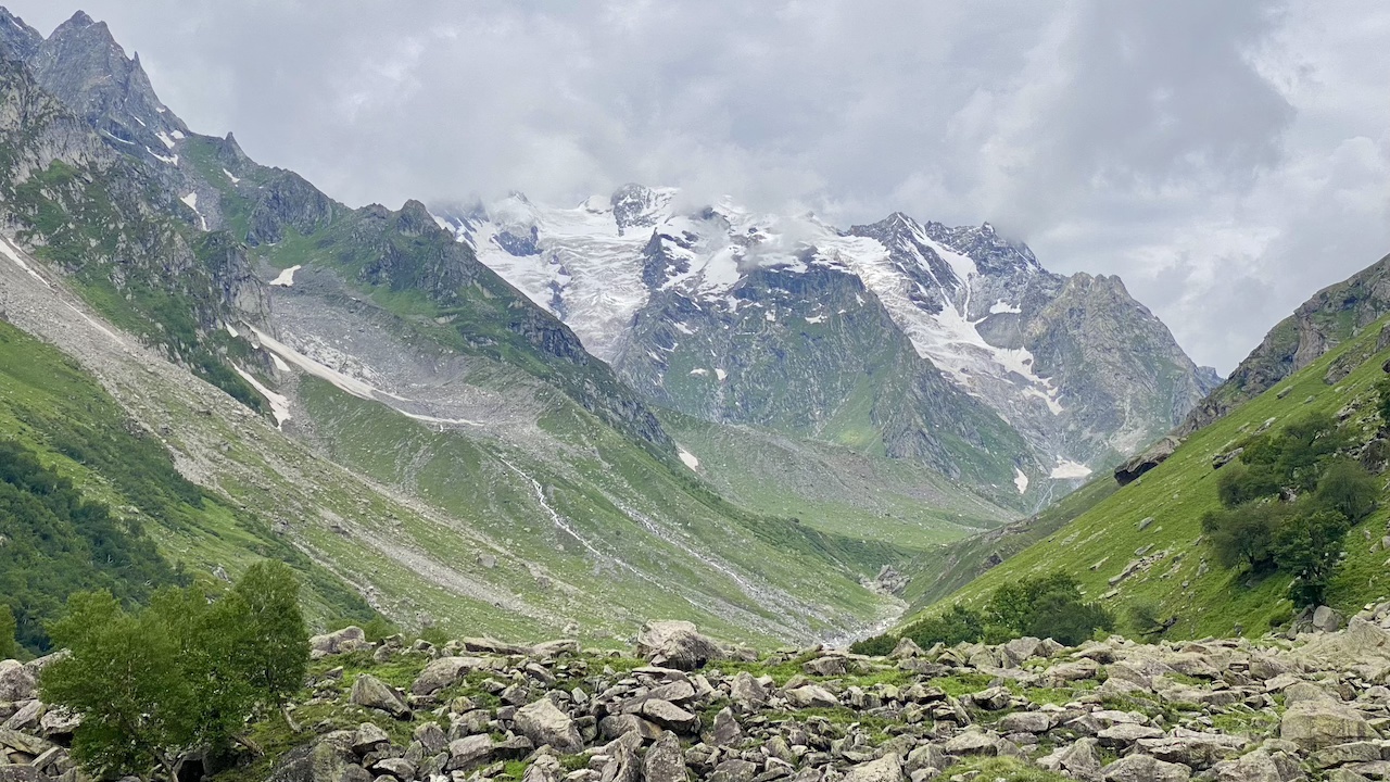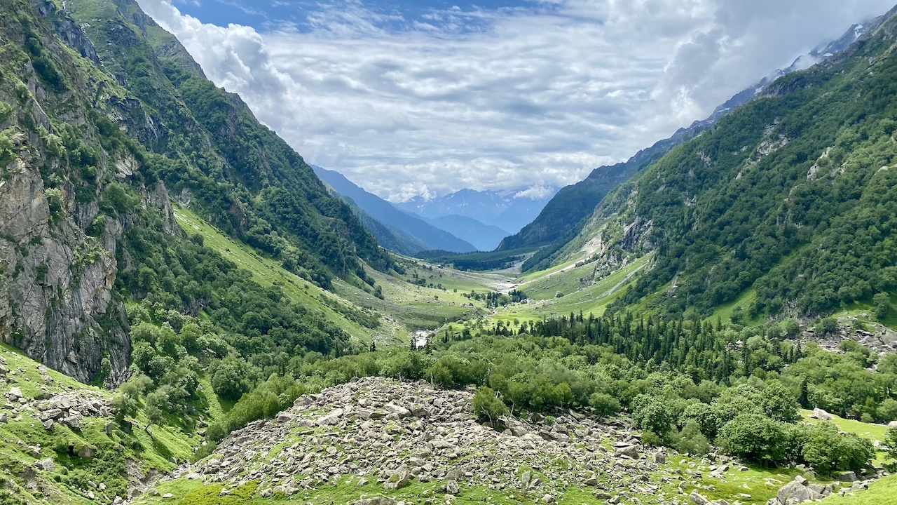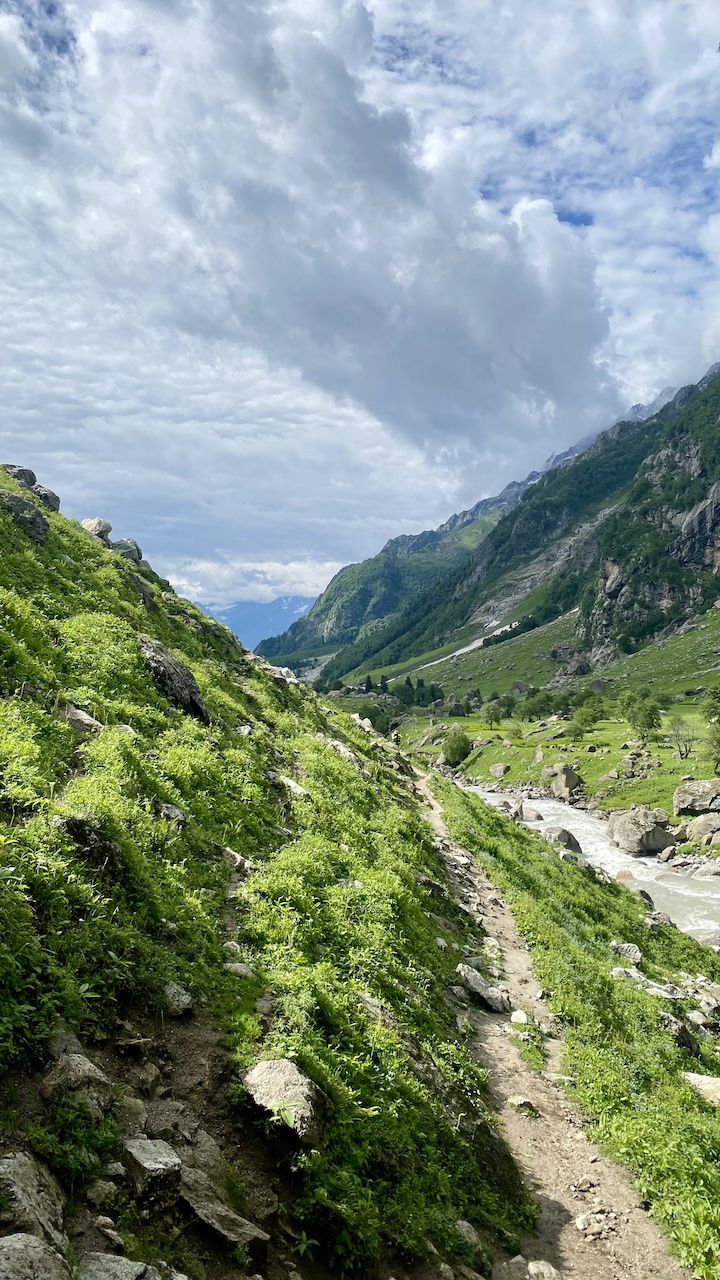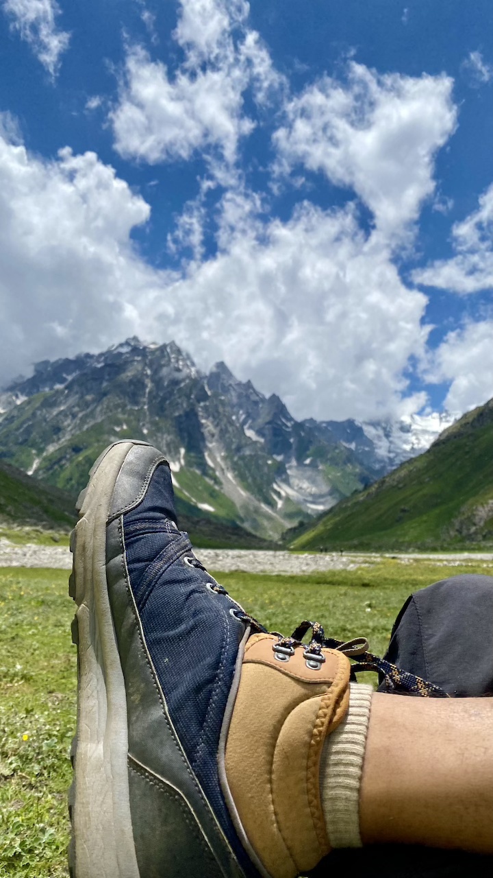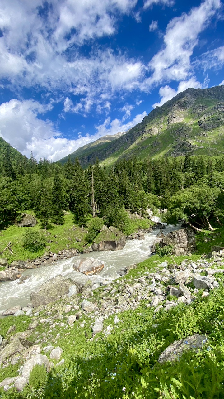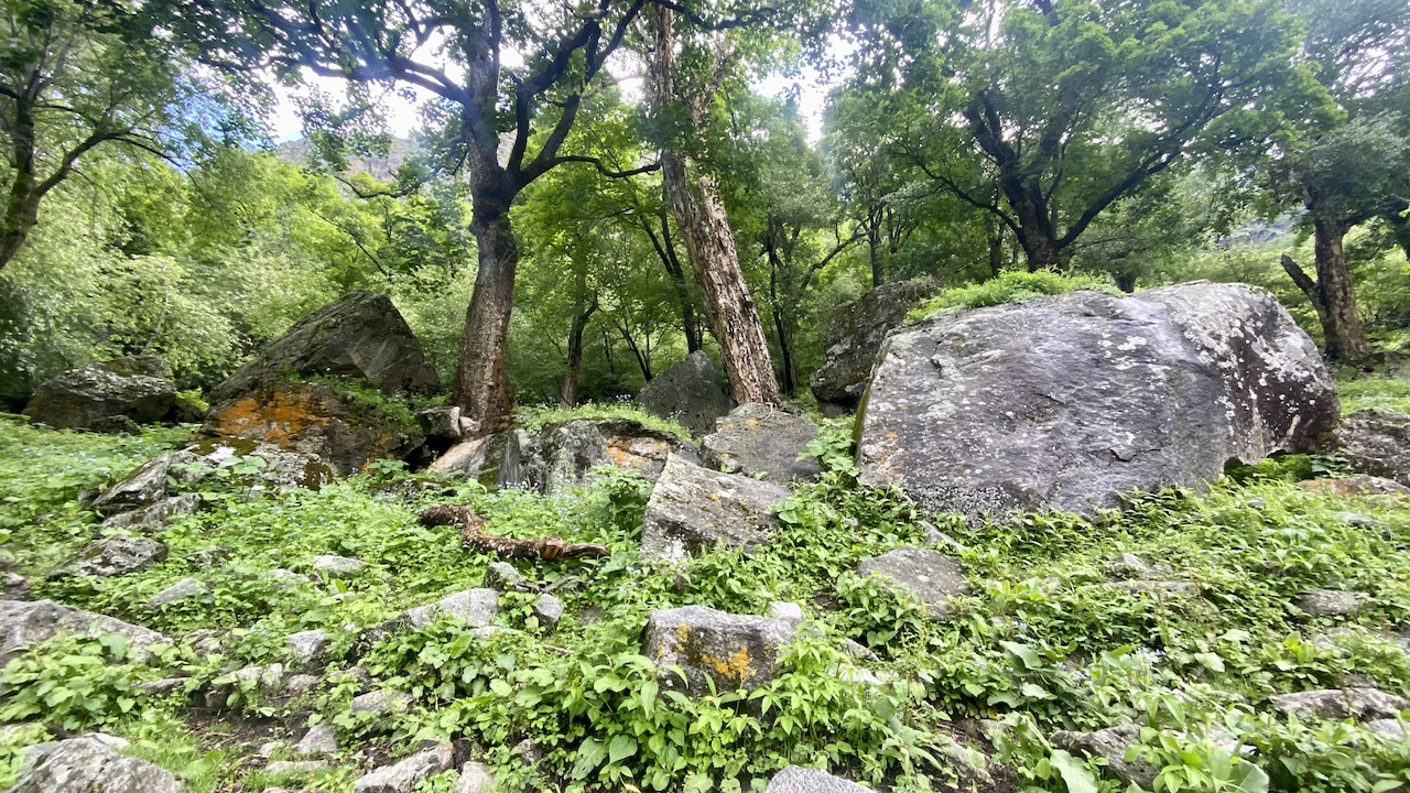 Today again, I was carrying two bags. We started our trek in the open meadows, following the river upstream. Soon we found ourselves back in the forest. This time, the stretch was not too long. We navigated through boulders in the shade of the trees and ended up in a place where we could hear the river flowing but could not see it. We took a little break there while the rest of the group joined us. This was the point where we saw the treeline fading behind us and a steep climb ahead. As we resumed our trek, the two bags made the ascent a bit challenging for me.