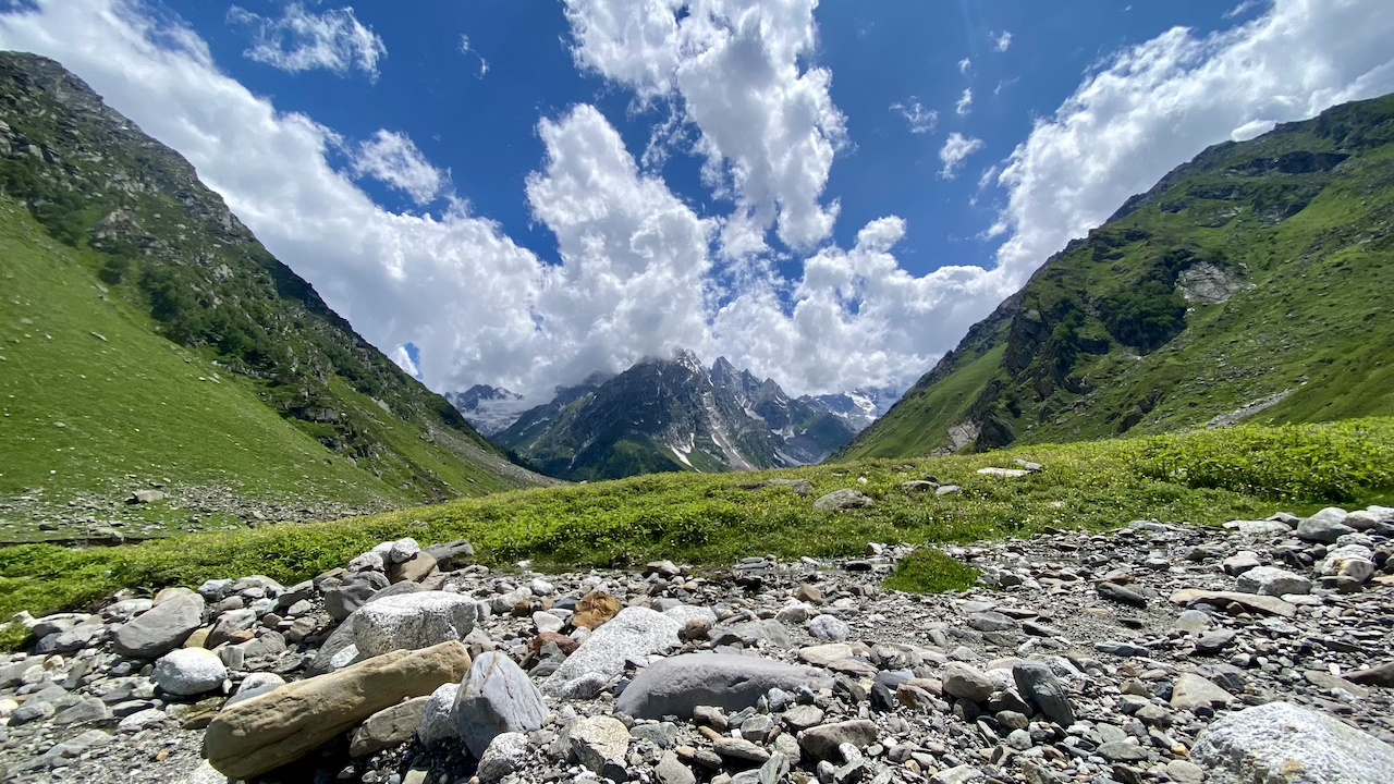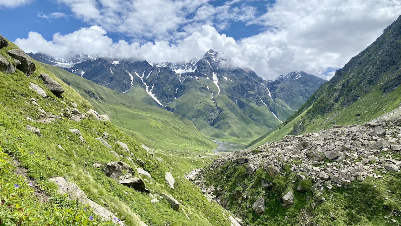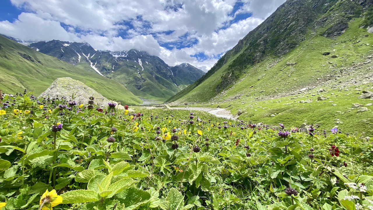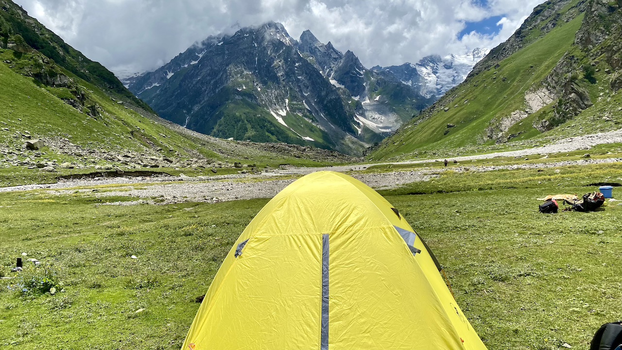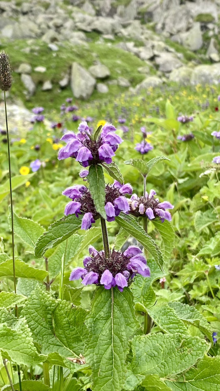 After about four hours of trekking, we arrived at our campsite around 12:15 PM. After lunch, I spent the rest of the day leisurely exploring the area. The site was a picturesque paradise, filled with beautiful flowers and numerous streams of clear, flowing water. Due to the grasslands, there were many shepherds, along with sheep, horses, and mules. We took a short walk up a nearby mountain to acclimatize, returning after about half an hour. Towards the end of the day, I packed everything into one bag to make it more convenient for the next day.