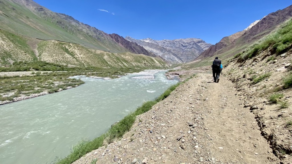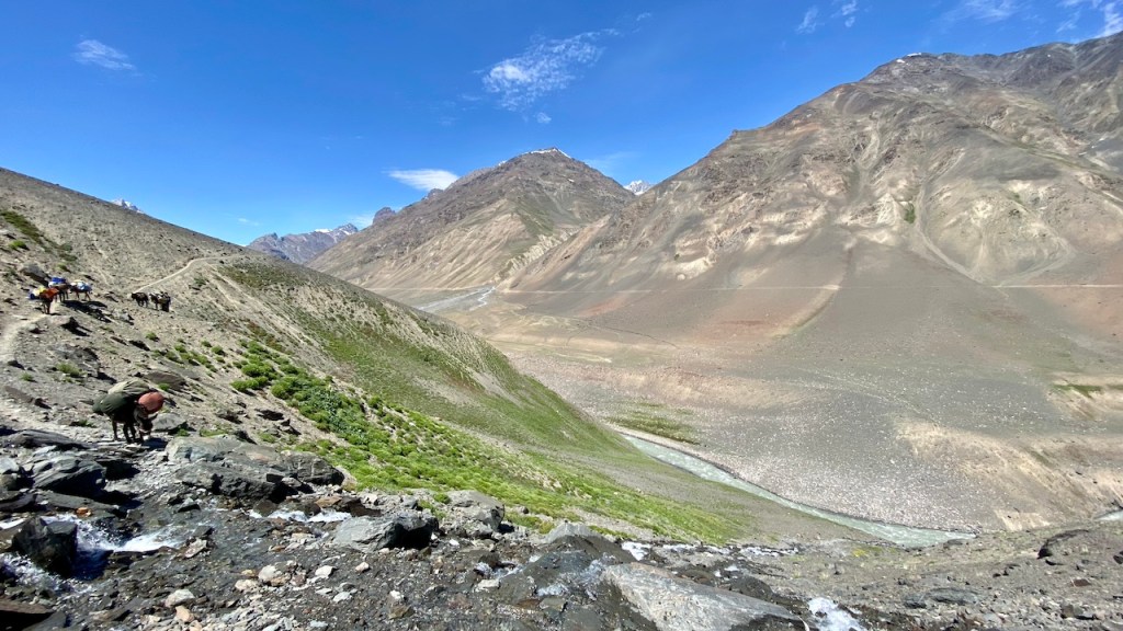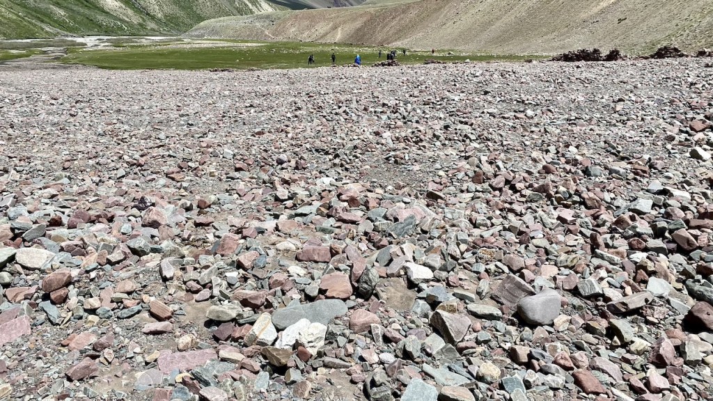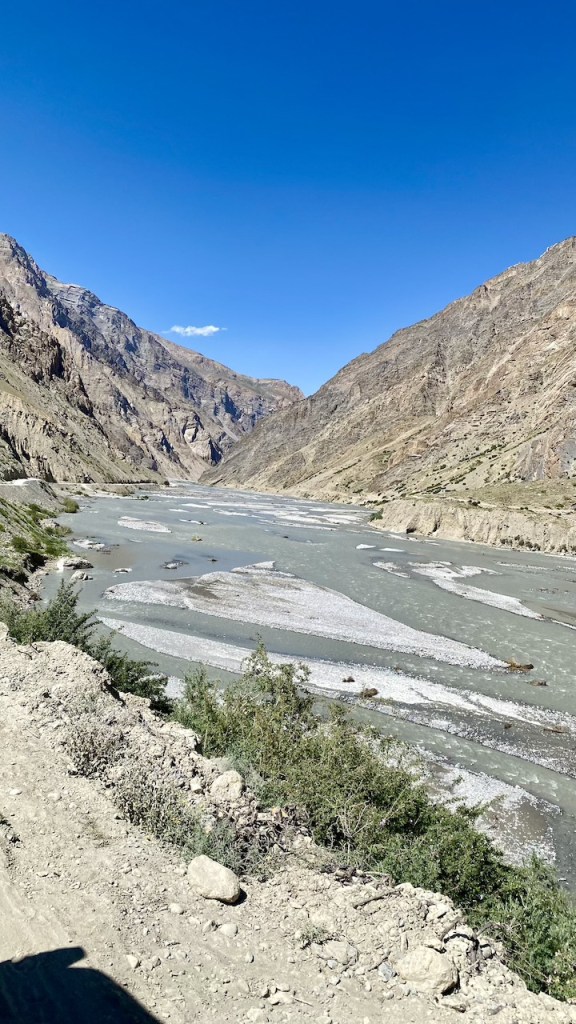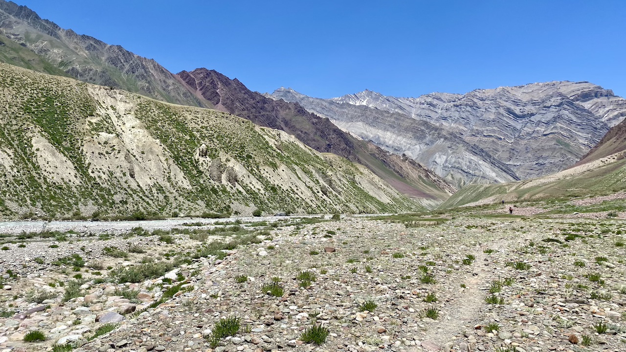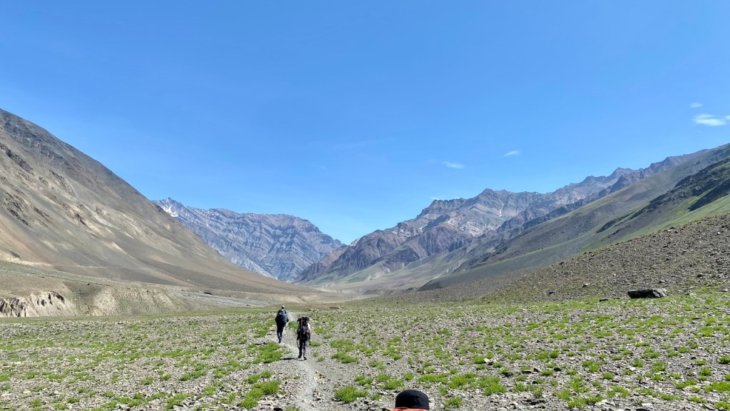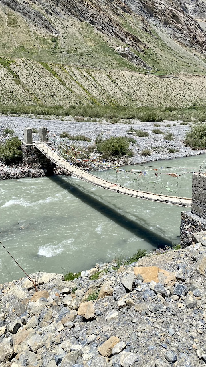 The landscape remained fairly consistent, making it a long, steady walk. We finally reached Mudh around 1:15 PM. Toward the end, we crossed the Pin River on a swinging bridge, suspended by nothing more than strings, adding a touch of thrill to the finish. After arriving, I took a much-needed break, had lunch, and dipped my feet into the cold, flowing water to recover from the long and tiring journey.