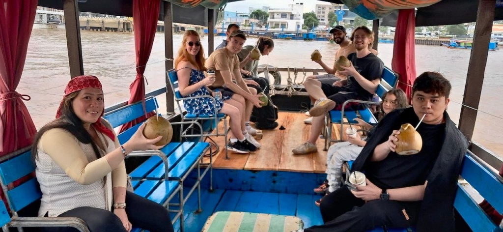 After exploring various sections and learning about the war strategies employed, we stopped for lunch, which was part of the tour package. With renewed energy, we headed to the Mekong Delta. The drive was longer this time, and upon arrival, I grabbed a quick coffee before boarding a boat. We were greeted with fresh coconut water, making for a refreshing start to the delta adventure.