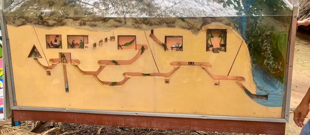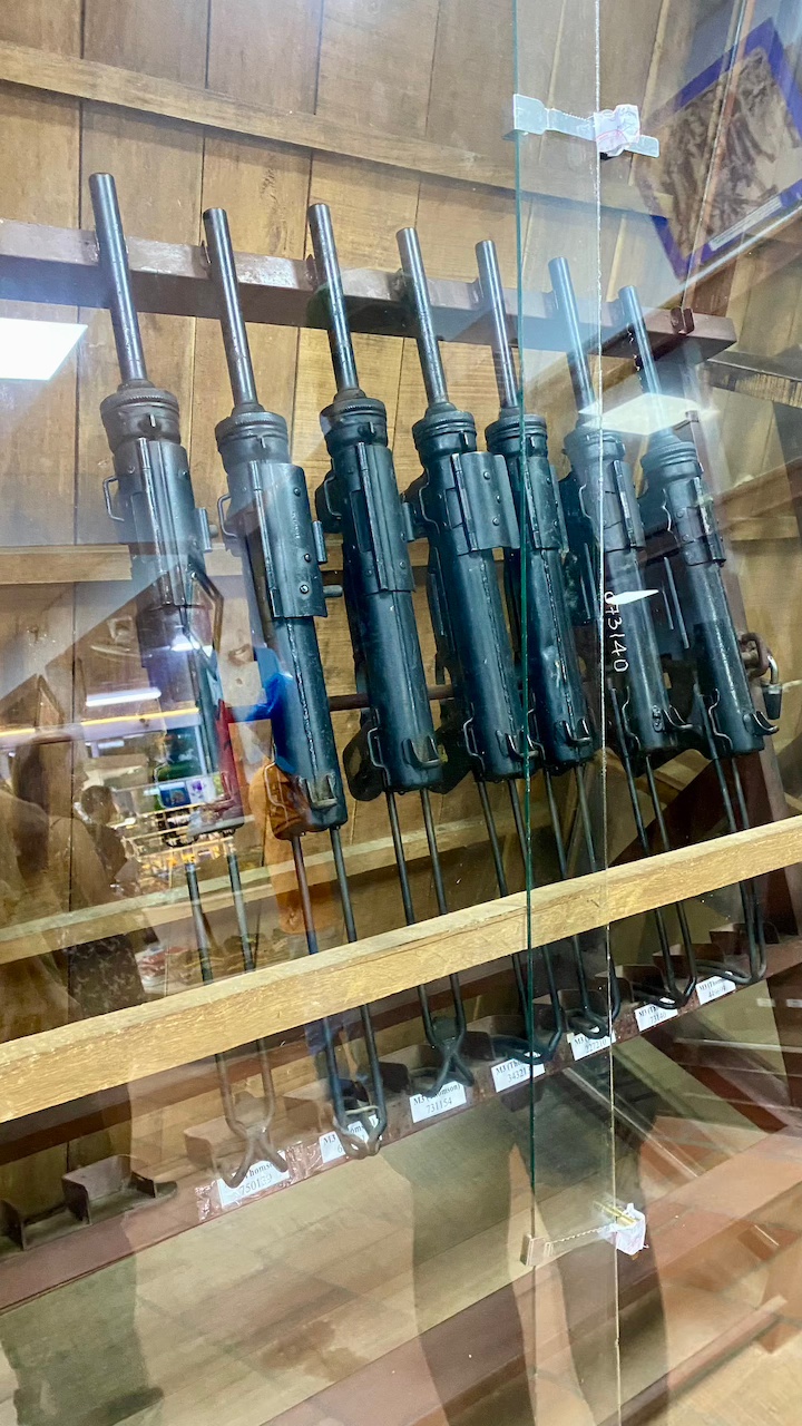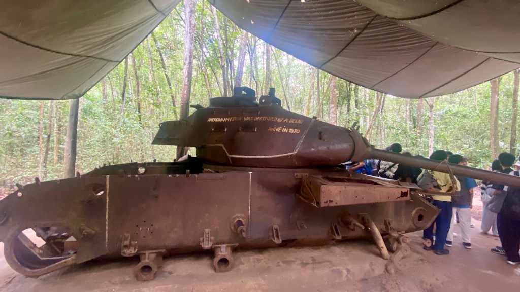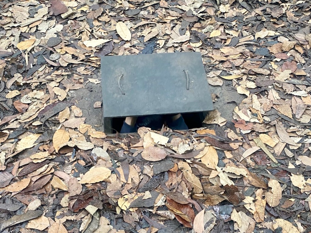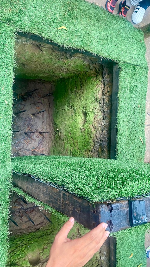 When we reached the Cu Chi Tunnels, it was drizzling, which made the weather cool and very pleasant—perfect for exploring. We collected our tickets and started the tour. The first exhibit displayed an array of weapons used during the Vietnam War, including rifles, bombs, and other artifacts. The highlight, however, was exploring the intricate network of tunnels. Stepping into one of them was an eye-opening experience—narrow, dark, and requiring a mix of crawling or shuffling in a hunched posture. On my first attempt, I mistakenly exited after just 20 meters. Determined, I re-entered the tunnels with a few others and managed to traverse 200 meters this time. The experience was both thrilling and exhausting, leaving me sweaty but fascinated by the resilience of those who once lived and fought within these tunnels.
