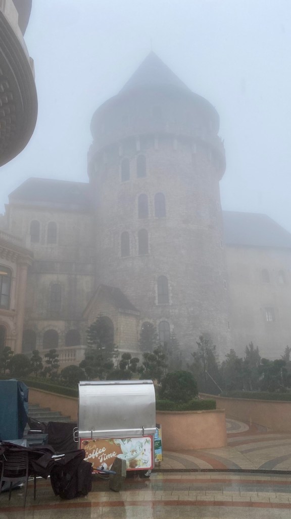 Our first stop was the famous Golden Bridge, the one with the giant stone hands holding it. But the moment we stepped out, we realized it was completely covered in mist. We quickly bought rain covers and walked onto the bridge, only to see nothing beyond a few feet ahead. A little disappointed, we moved towards the French Village, where I had been excited to see the castles. Unfortunately, the thick mist turned them into nothing more than silhouettes.