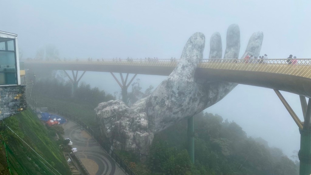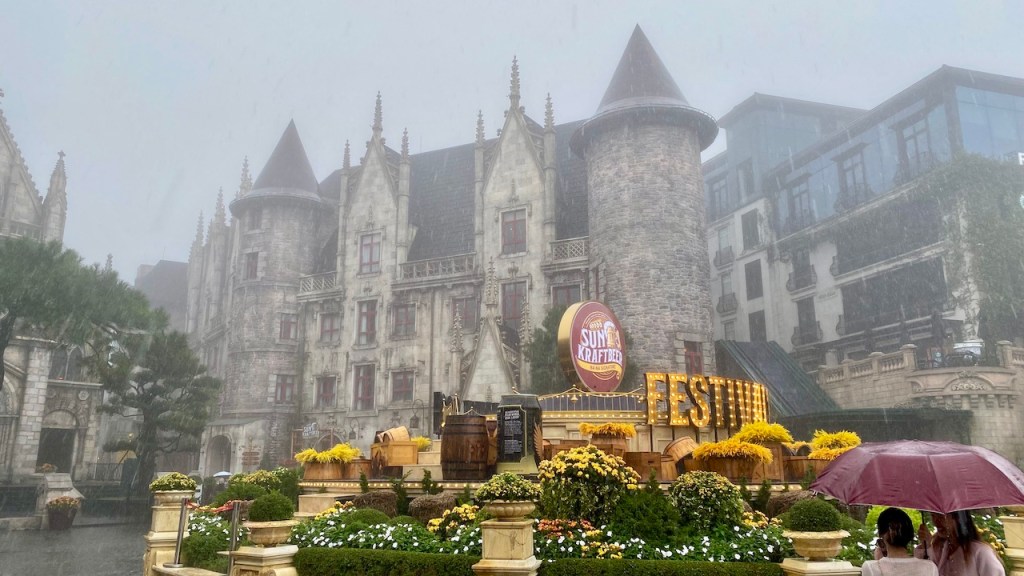 Our Airbnb stay included breakfast, and the freshly prepared meal was a great way to start the day. After finishing up, we booked a cab to Ba Na Hills Resort, which took about an hour and a half to reach. Just as we arrived, it started pouring heavily. The car dropped us off at the parking area, but thankfully, the resort had shuttle buses to take visitors to the entrance.